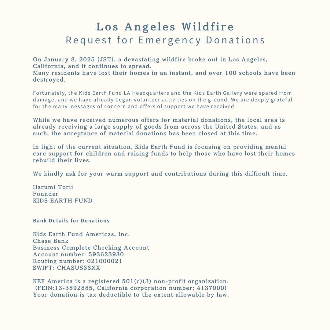 Fortunately, the Kids Earth Fund LA Headquarters and the Kids Earth Gallery were spared from damage, and we have already begun volunteer activities on the ground. We are deeply grateful for the many messages of concern and offers of support we have received.